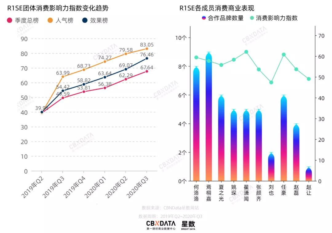 同团其他成员共获得超过50家品牌青睐,团队的商业价值一路飙升。2019年6月出道后,R1SE的消费影响力在季度总榜、人气榜、效果榜三个维度均有明显上升,其中人气指数由40上升至83.05。