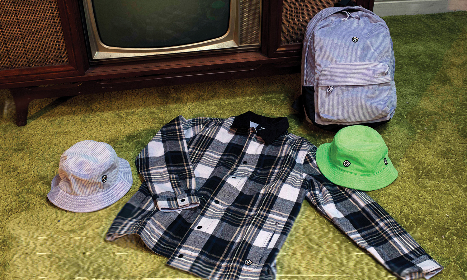 两款男士夹克同样以紫色为主色调,分别做了紫色格纹和纯紫色设计,颇具巧思的细节设计在于夹克的领上,Anderson.Paak特别配以黑色灯芯绒衣领,使整体更具玩味。出街装备当然少不了大热的渔夫帽,系列还囊括了由紫色灯芯绒和凯利绿绒毛面料打造的两款渔夫帽,纯色设计简洁,并配以品牌的圆形“V”标。