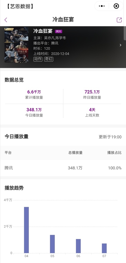 《冷血狂宴》是今年腾讯视频第一部以独家版权上线的院转网电影,定价也是国内平台最高的。