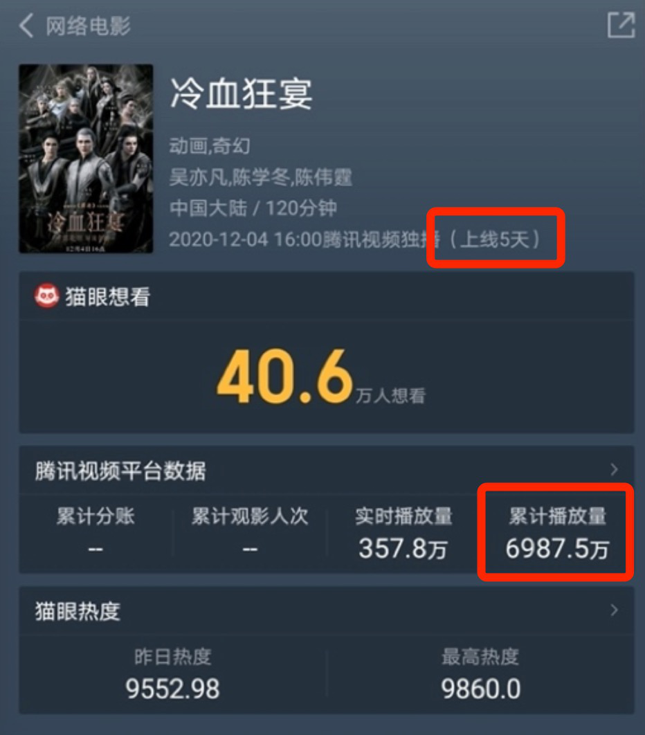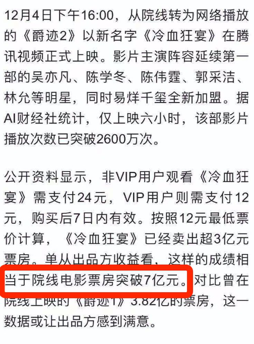 12月5日,《冷血狂宴》上线24小时,累积播放量近5000万。网上很快有了影片点播收入相当于院线票房破7亿的报道。