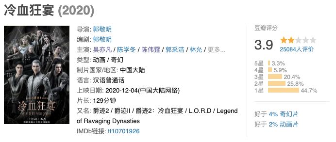 12月4日,改名《冷血狂宴》的《爵迹2》在推迟两年之后,终于在腾讯视频以单片付费点播的模式上线——会员12元、非会员24元即可观看7天。