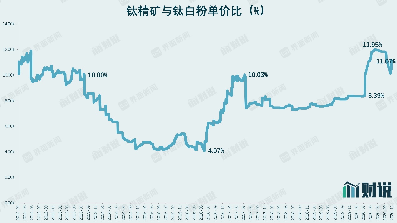 数据显示,钛精矿价格从年初的1250元/吨涨至1650元/吨。钛精矿涨价后,一吨钛精矿与钛白粉单价的比例达到10.5%,接近12%的历史高点。