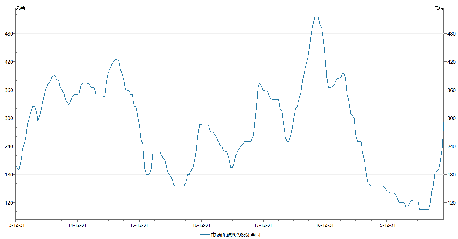 国内硫酸(98%)涨势更为剧烈,从二季度的120元/吨左右涨至297.1元/吨。