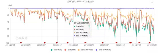 以《全民飞机大战》为例,上线后长期保持畅销榜前列,即便到了2016年中旬,依旧可以通过活动营销从《王者荣耀》手中拿下榜首。进入2018年,游戏跌出TOP 100,现今保持200开外。