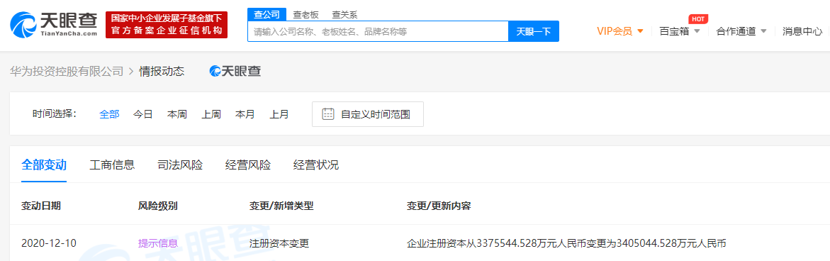 据天眼查APP显示,近日,华为投资控股有限公司发生工商变更,企业注册资本从原来的约337.55亿人民币新增至约340.5亿人民币。