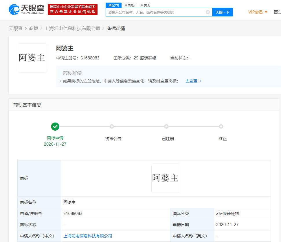 据天眼查APP显示,近日,B站关联公司上海幻电信息科技有限公司新增多条商标申请,其中包括名称为“阿婆主”的商标,申请/注册号为51688083,商标分类为服装鞋帽,目前状态为商标申请中。