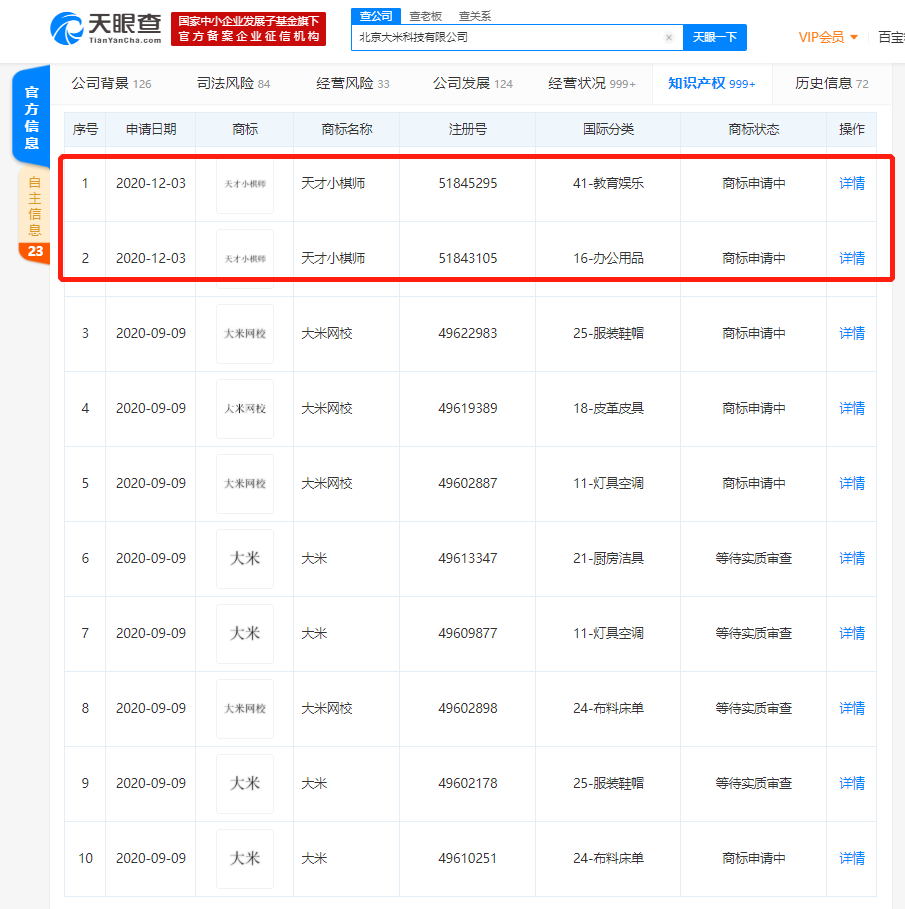 据天眼查APP显示,近日,北京大米科技有限公司(VIPKID)新增多条商标信息,其中2条名称为“天才小棋师”,申请日期均在2020年12月3日,国际分类分别为教育娱乐、办公用品。