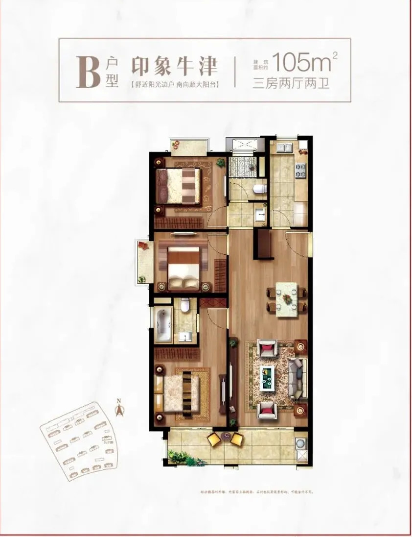 此外,像建筑面积约105㎡的三房两厅两卫户型,更是大尺度规划,让每一室皆享宽阔舒展空间,餐客厅一体连接约6.2米观景阳台,无遮挡视野,尽揽天地。