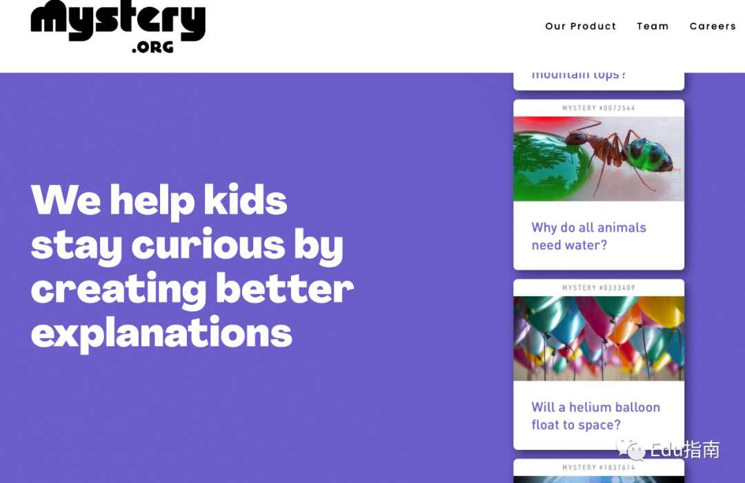 创建Mystery.org的目的是“为孩子们对这个世界的每个问题,创建更好的解释。”“从儿童向老师提出的150个最常见的科学问题开始。这些问题统称为“神秘科学”。去年,美国50%的小学中有超过400万儿童使用了“神秘科学”。已经售给数千所学校。“将继续讨论孩子们在学校永远不会学到的所有其他问题。在过去的18个月中,收到了来自儿童的500,000多个问题,这些问题渴望对世界做出更好的解释。”现在,“我们为每个问题创建视频解释。可以将其视为儿童的可视化Wikipedia。”