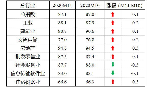 行业景气状况继续分化。11月份,工业和建筑业指数连续三个月上升或持平,交通运输邮政仓储业和批发零售业指数连续5个月上升或持平,房地产业和住宿餐饮业指数转降为升,社会服务业指数由升转降,信息传输计算机软件业连续两个月下降。