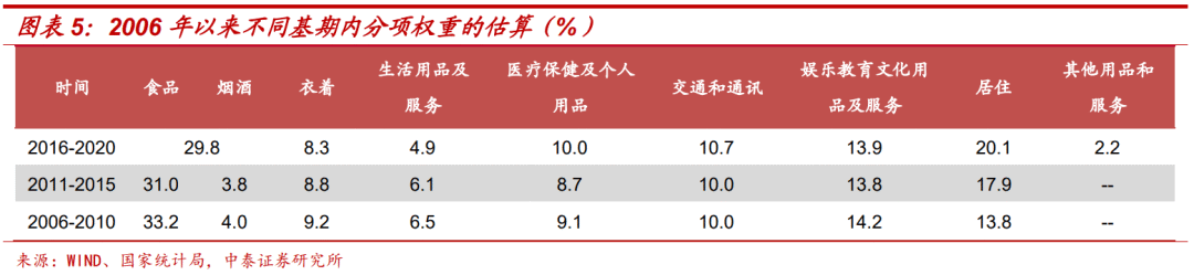 综合上述方法,我们估算了2006年至今CPI八大类分项的权重变化,如下表所示。