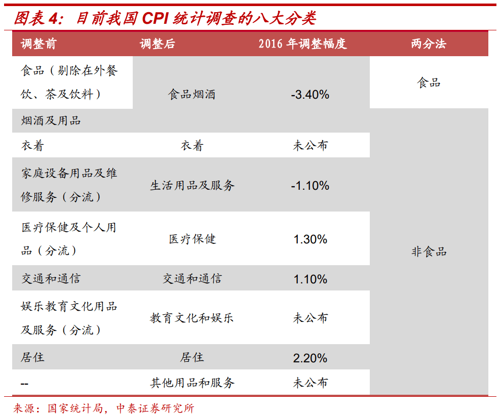 2016年:同时调整大类分项、项目内涵和细项权重。主要是下调食品项权重3.2个百分点,分别上调居住项和医疗保健项权重2.2个百分点和1.3百分点。