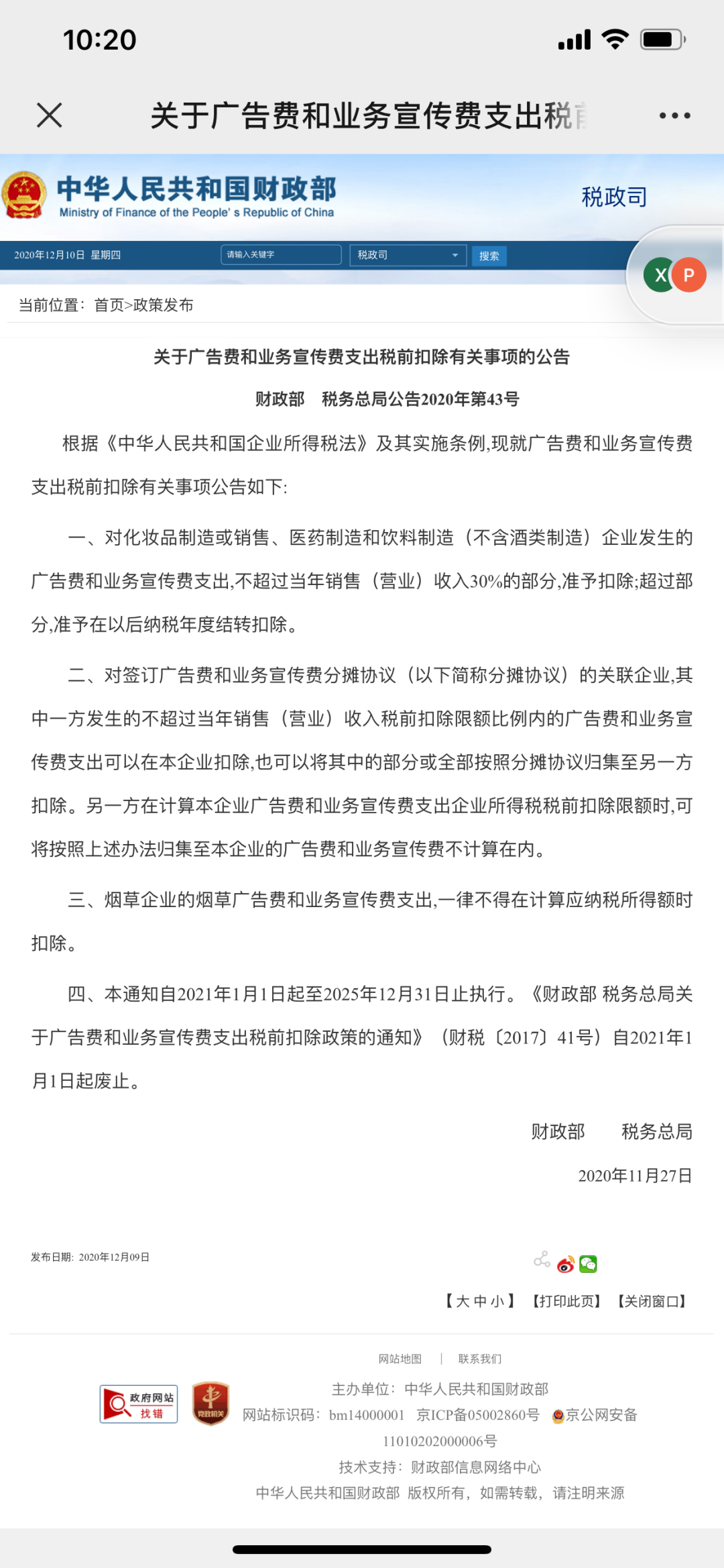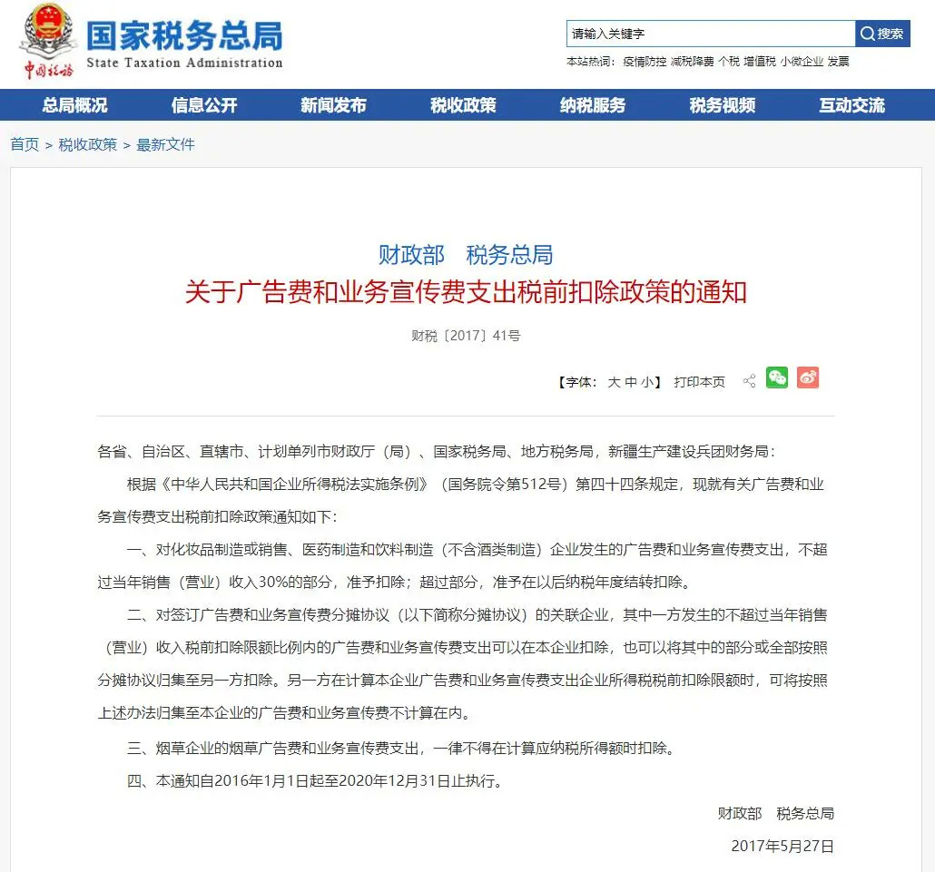 12月9日,国家财政部、国家税务总局发布《关于广告费和业务宣传费支出税前扣除有关事项的公告》,公告显示:
