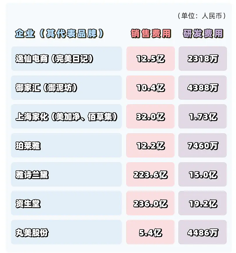 这就愈发促使化妆品企业倍加重视营销投入,其中广告是极大投入版块,其余还包括业务宣传费、门店和货架铺设等等。