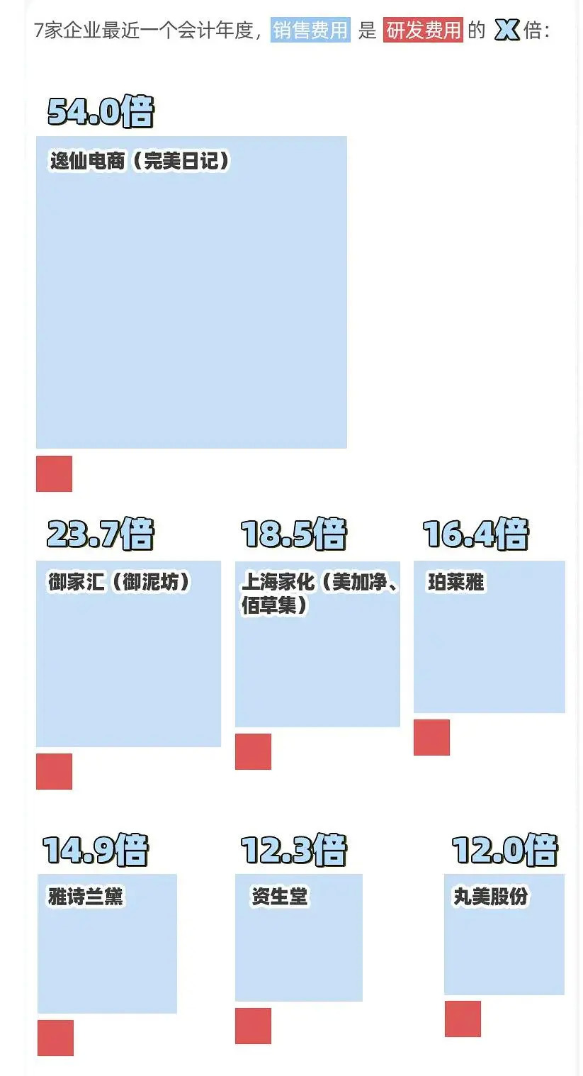 从另一维度看,不少企业的营销费用超研发费用10倍以上,更甚者达几十倍之多。例如,丸美股份、资生堂、雅诗兰黛、珀莱雅、上海家化、御泥坊的这一倍率为12.0、12.3、14.9、16.4、18.5、23.7倍,而逸仙电商的销售费用甚至达研发费用的54.0倍!