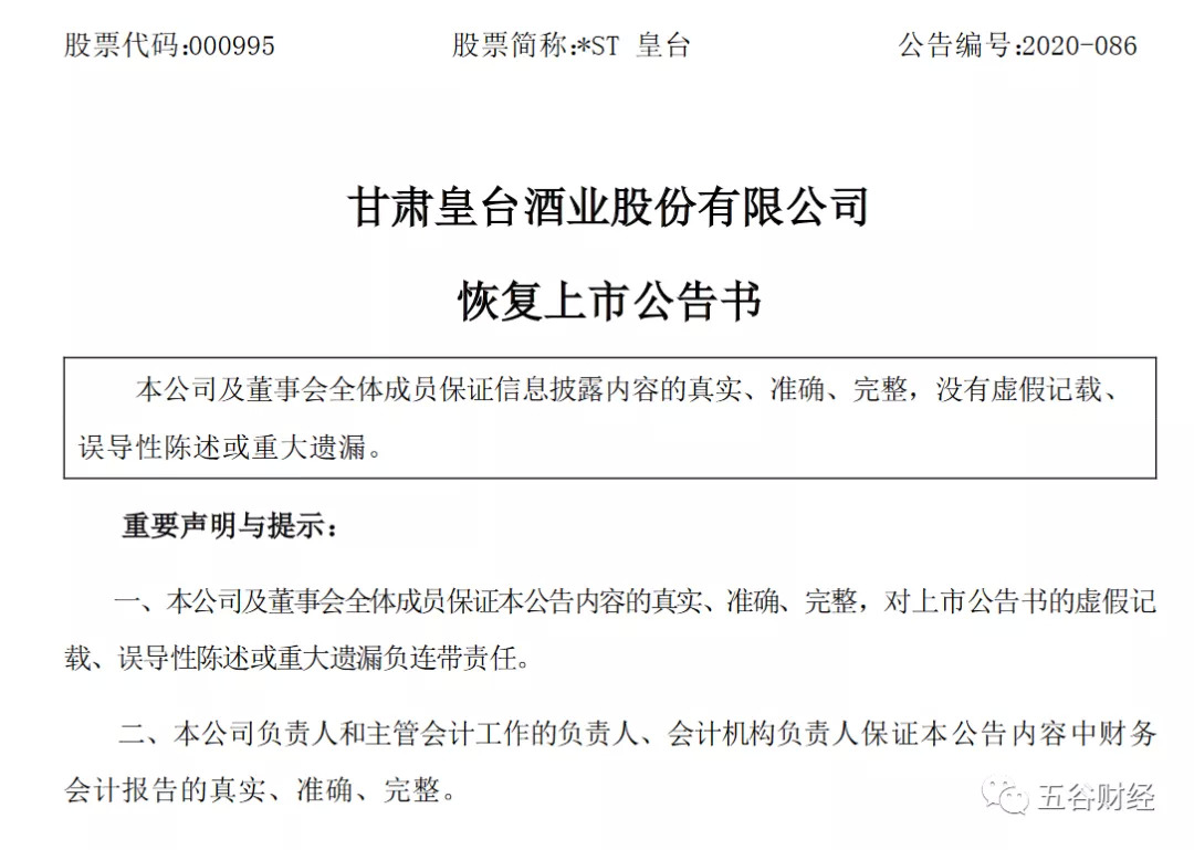在暂停上市一年之余后,皇台酒业(股票简称*ST皇台)突然发布了《恢复上市公告书》,股票将于2020年12月16日恢复交易,当天,公司A股股票当日交易不设涨跌幅限制,不纳入指数计算。