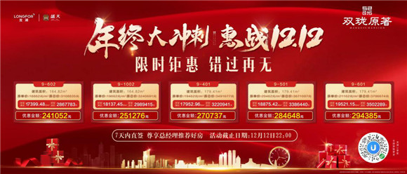 龙湖盛天·双珑原著,建筑面积约163-190㎡青秀约60米邕江低密平墅,耀世开盘,年终冲刺期,恰逢狂欢双十二,尊享多重限时钜惠惊喜。特惠臻席全城火爆预约中,争藏从速!恭迎亲临品鉴!