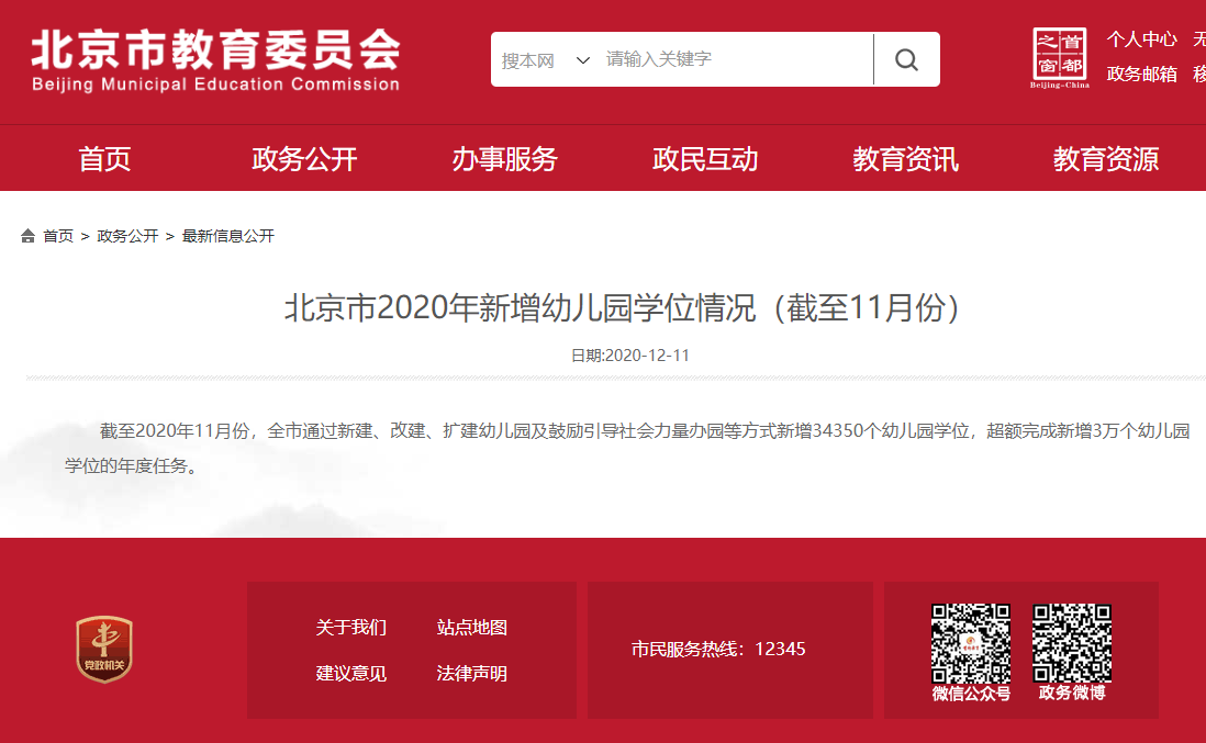 12月11日,北京市教育委员会官网发布《北京市2020年新增幼儿园学位情况(截至11月份)》:截至2020年11月份,北京市通过新建、改建、扩建幼儿园及鼓励引导社会力量办园等方式新增34350个幼儿园学位,超额完成新增3万个幼儿园学位的年度任务。