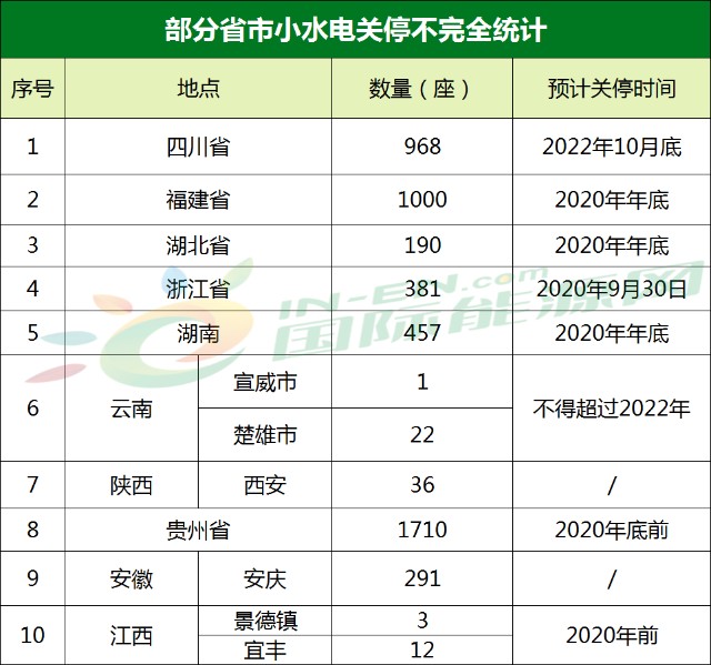 全国各地开始制定时间表,将关停小水电提上日程。国际能源网记者了解到,仅四川省,要退出关停的小水电就有968座,需整改和退出的小水电有4705座,占比94%。福建省泉州市关停了41座小水电、湖北省十堰市房县关停19座小水电、陕西西安市关停36座小水电、浙江已于今年9月底在全国率先全面完成小水电清理整改销号工作,比四部委部署目标提前了3个月……