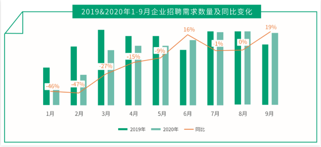 从招聘数据来看,2020年Q1季度整体受疫情影响比较严重,大部分的互联网企业处于观望的状态,招聘需求较2019年同期下降40%左右。直到3月份开始疫情逐渐稳定,互联网行业陆续开始到岗复工。招聘需求在4月份开始逐渐复苏,到6月份达到高峰期。
