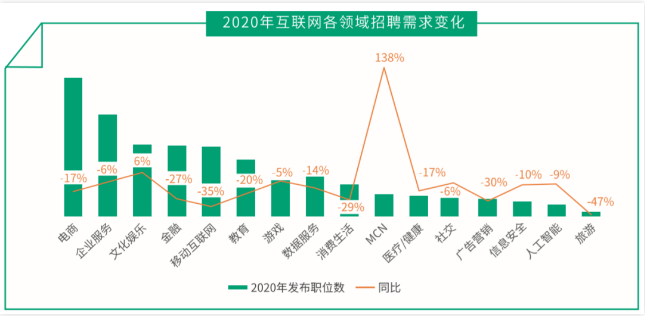 相比于其他行业受疫情冲击严重,互联网行业没有受到明显的影响,1月至9月新增企业数同比增长35%。部分互联网行业反而乘风破浪,趋势向好,比如MCN行业异军突起,招聘需求逆势提升138%。