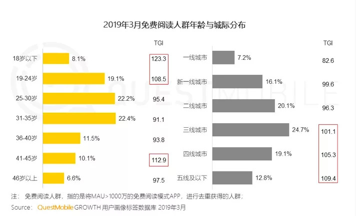 各个免费平台的崛起也是我们熟悉的配方。和拼多多、趣头条一样,免费阅读也看中了下沉市场。根据QuestMobile 2019年3月数据显示,免费小说用户集中分布在二线及以下城市,这部分群体占据了免费阅读总体的76.7%。