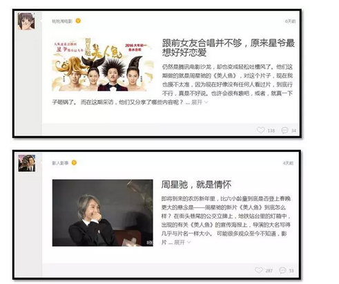 2. 依托「内容营销」放大「周星驰」这块金字招牌的号召力。「年初一,去电影院还星爷的票钱」,这句话想必大家都听得很多吧,而这正是发行团队在用「自来水营销」大打粉丝牌。