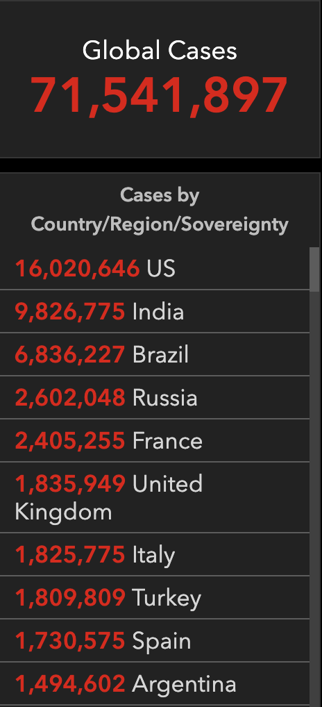 据约翰斯·霍普金斯大学的疫情追踪数据,截至北京时间12月13日上午8点,全球累计确诊新冠肺炎病例71541897例,死亡1602500例。