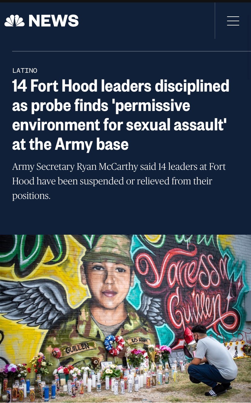 △美国广播公司报道,14名胡德堡陆军基地官员因长期纵容性侵和性骚扰行为而被处分