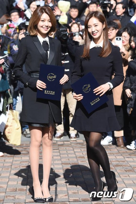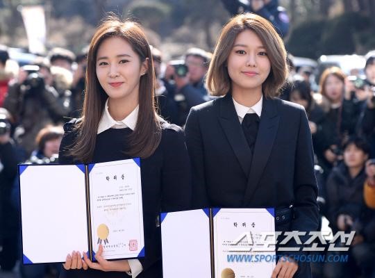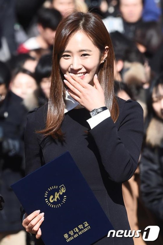 2月15日下午,韩国演员朴信惠、少女时代成员Yuri、秀英在首尔参加了韩国中央大学2015毕业典礼。韩国中央大学以戏剧系、电影系、摄影系和新闻系最负盛名,金秀贤、金喜善、玄彬、河政宇等都是该校知名校友。