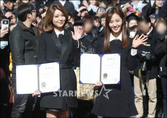 图片来源:News1少女时代Yuri和秀英手举毕业证合照。