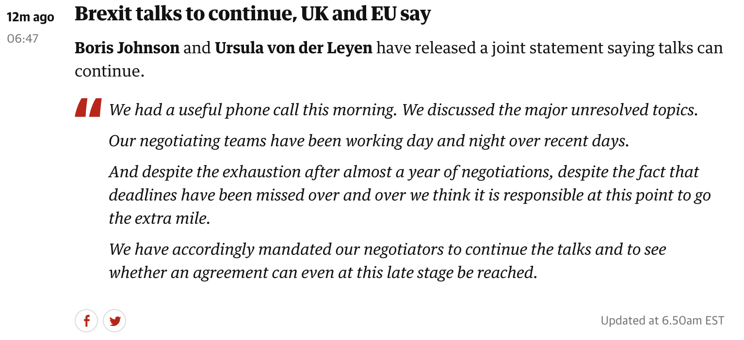 据英国《卫报》13日报道,英国首相约翰逊和欧盟委员会主席冯德莱恩同意继续进行英国脱欧贸易谈判。