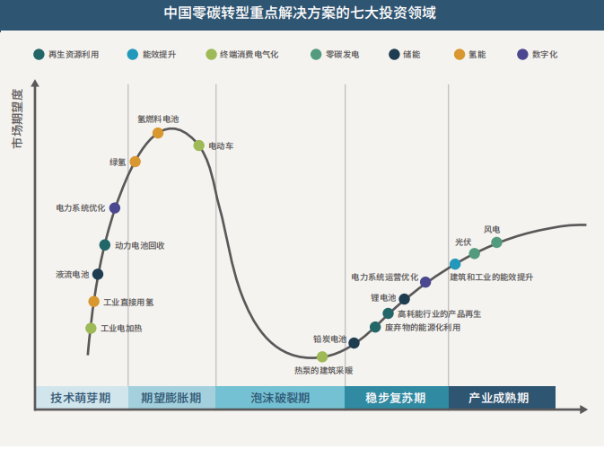 由落基山研究所和中国投资者协会能源投资专业委员会共同编写的《零碳中国·绿色投资》报告指出,中国零碳能源转型将在七大领域催生巨大的投资市场,包括可再生能源利用、能效、终端消费电气化、零碳发电技术、储能、氢能和数字化。