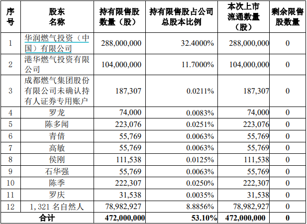 值得注意的是,此次解禁涉及的股东极度分散,成都燃气有多达1333位股东解禁,其中1331位为自然人股东。