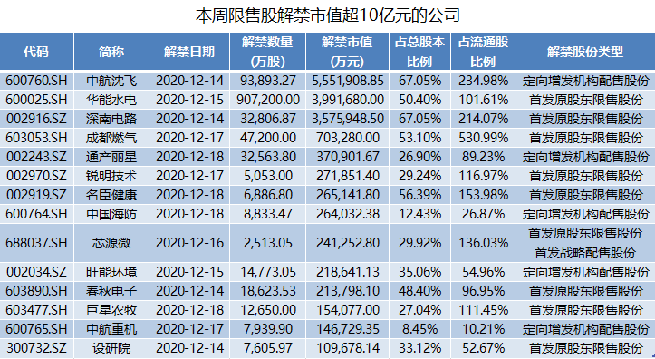 此外,本周限售股解禁数量超过1亿股的上市公司合计有10家,前三分别为华能水电、中航沈飞、成都燃气。同时,解禁市值超过10亿元的上市公司有14家。