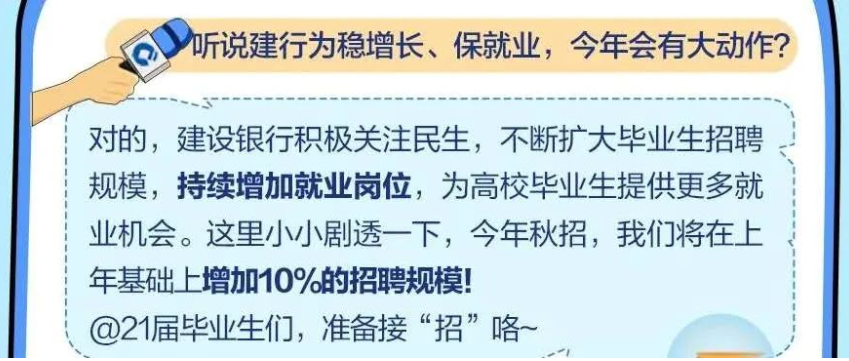 建设银行宣布,今年秋招将在上年基础上增加10%招聘规模。中国银行发布的职位超过1万个,比上一年增加15%以上。