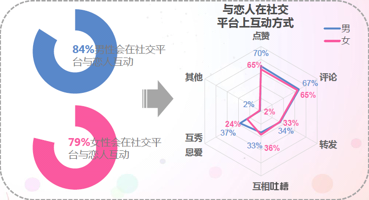 此外,数据还显示男性比女性更愿意秀恩爱。有94%的男性愿意用恋人的照片做桌面/屏保,而女性则只有78%。而在社交平台上点赞、评论、互秀恩爱、转发等行为,男性均比女性更积极。