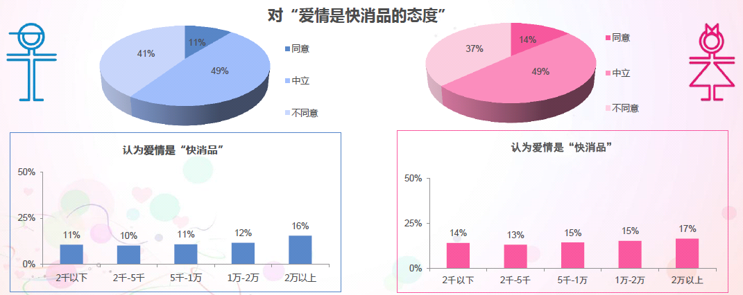 生活节奏不断加快,恋爱也是“从前慢”了么?调查表明仍有四成单身男女认为时间能够证明爱情的成色。但也有11%的男性和14%的女性认为爱情是“快消品”,激情没了就要早说早散。对爱情是“快消品”的赞同度与收入成正相关,收入越高,赞同者占比越大。当收入标准达到2万以上时,有16%的男性和17%女性认为爱情是“快消品”。