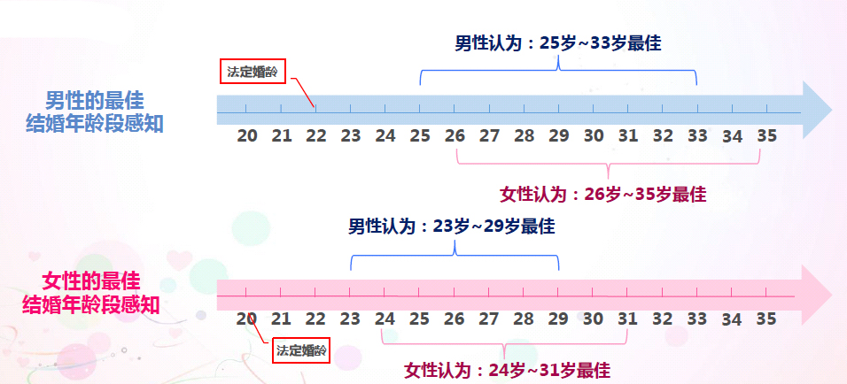 年轻群体对恋爱结婚的迫切程度具有明显的性别差异,这也从侧面印证了男女对最佳婚龄的认知区别。调查显示,女性认为自身最佳婚龄为24岁-31岁,而男性认为自己在25岁-33岁间结婚最合适。同时,男性对女性最佳婚龄的设定要比女性自身感知平均小一岁,女性则给男性最佳婚龄长了一岁。显然,男性更喜欢年轻妹子,女性希望丈夫更成熟。