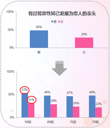 那么“蓝颜蓝颜,蓝着蓝着就绿了”,这句话又有几分正确?调查显示有过异性知己的男性中有48%曾想过将女知己发展成恋人,高出女性20个百分点。90后明显比前辈们更懂得玩暧昧,无论男女,想把异性知己发展成恋人的比重均高出全国平均水平。而在重点省份和城市中,山西男性最有意愿把女知己变成女友,比重高达60%;青岛则相反,有49%的女性希望把身边的蓝颜攻略成男朋友。
