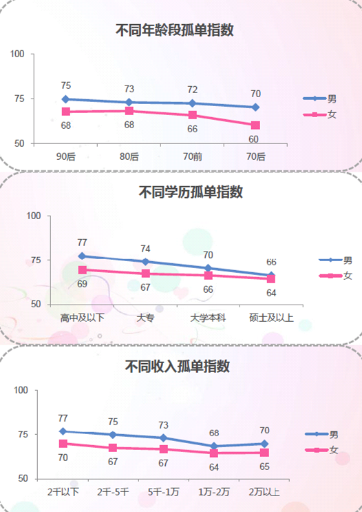 单看年龄层分布,男女均是年龄越小孤独指数越高。看来“单身久了,孤独久了,就习惯了”这句话,还是有现实依据的。此外,孤独指数与学历和收入水平呈正相关,低学历、低收入的人孤独感明显更高。如高中及以下学历的男性,其孤独指数比硕士及以上男性高11分。