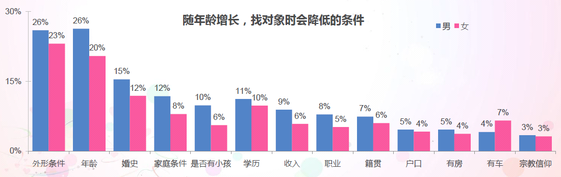 同时随着年龄增长,找对象时也不可避免地会降低条件,数据显示,男性会在33岁时放宽要求,女性为31岁。外形、年龄是单身男女首先放弃的标准,但房车和户口始终是没商量余地的硬性条件。