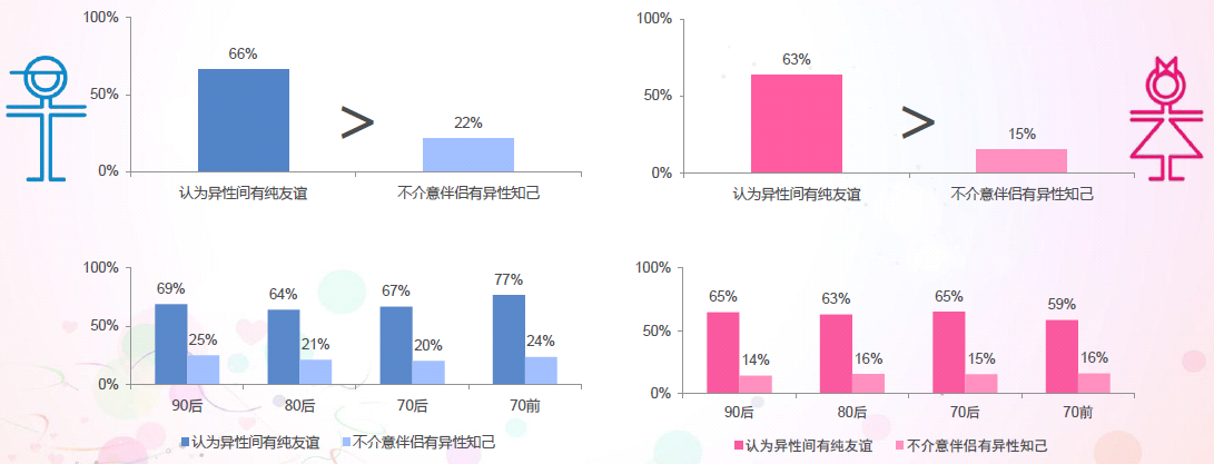 “男女之间是否有纯友谊?”是个经常会被拿来讨论的话题,此次调查证明,大部分人愿意相信有,却不允许异性知己出现在自己的恋人身边。全国范围内,超六成单身男女认为男女间有纯友谊,可只有两成左右人不介意恋人有异性知己。有77%的70前男性认可异性间的纯友谊,是各年龄段中比重最高的,而70前女性则正好相反,59%的比重是各年龄层中最低的。