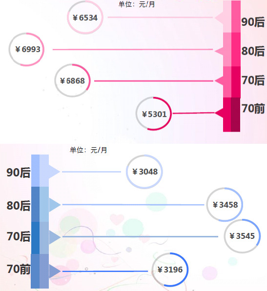 以年龄划分,恋爱起步价则呈“两端低,中间高”分布。90后与70前单身男女对理想对象的收入要求明显低于80后和70后,其中70前女性的恋爱起步价仅为5301元,比倒数第二低的90后女性还少1233元。