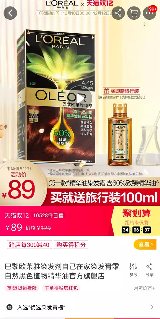 值得一提的是,这款于2019年9月正式上市的产品,是巴黎欧莱雅旗下的第一款精华油染发霜,具有里程碑的意义。根据天猫欧莱雅美发官方旗舰店显示,该产品月销超3万件,并入选了天猫“优选染发膏”榜。