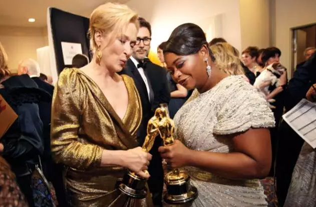影后梅丽尔·斯特里普与最佳女配奥克塔维亚·斯宾塞,2012年奥斯卡颁奖典礼。Art Streiber
