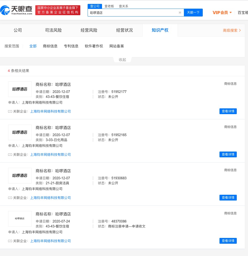 据天眼查APP显示,12月7日,哈啰关联公司上海钧丰网络科技有限公司新增多条“哈啰酒店”的商标信息。涉及的国际分类为餐饮住宿、日化用品、厨房洁具等。目前商标状态为“商标申请中”。