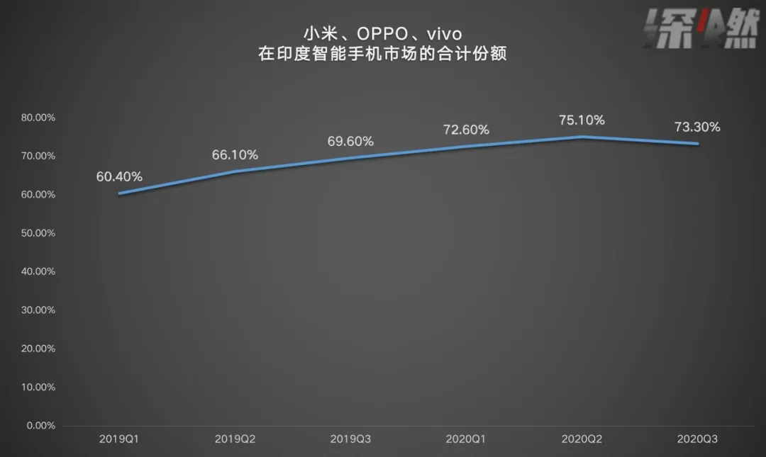 中国手机厂商瓜分了印度大半市场,从去年至今年,仅小米、vivo、OPPO+Realme,在印度手机市场拿到的市场份额便从60%扩展到75%,而印度本土巨头厂商Mircomax、Intex早已沦为others。