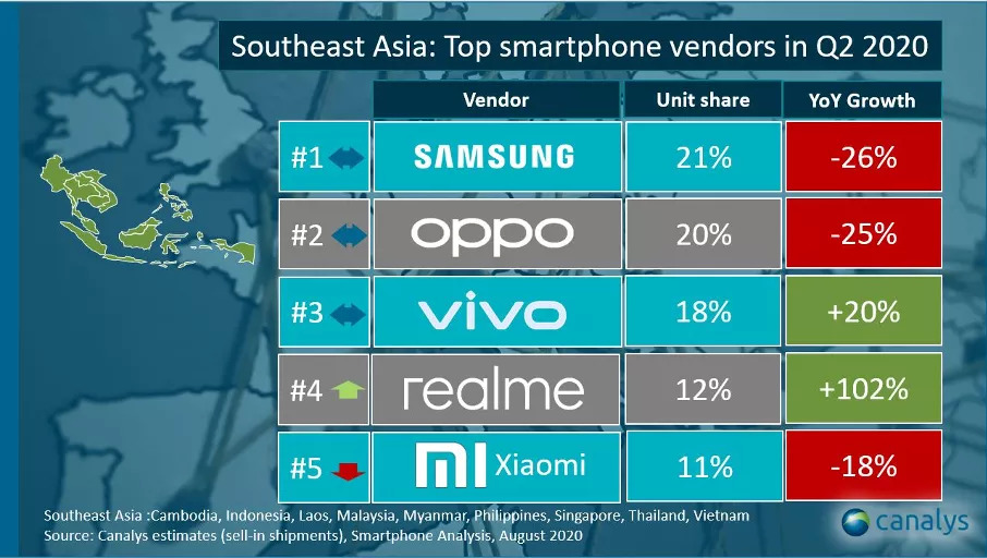 Canalys2020年二季度的统计显示,中国手机厂商OPPO、vivo、Realme、小米占据了东南亚智能手机市场当季出货量的61%。