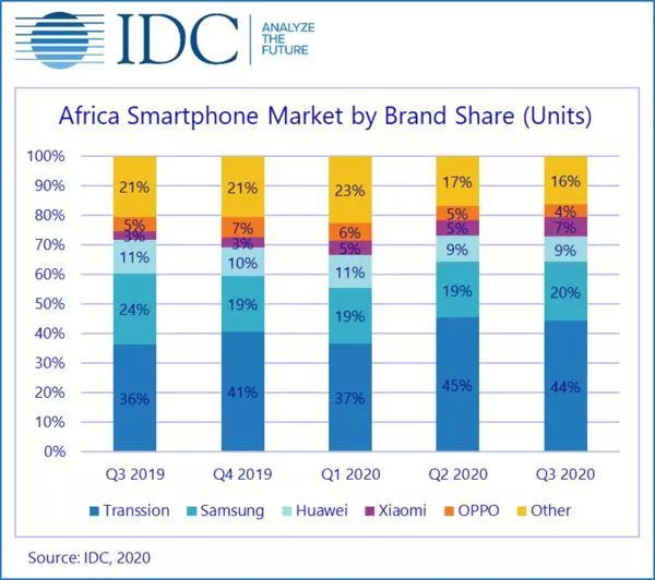 2016年,传音占非洲手机市场总份额的7%,三星为31%,至2019年底,传音掌握着非洲52%的市场份额,华为、小米、OPPO分别排名第三到第五位。IDC最新数据显示,2020第二、三季度,中国四大手机厂商在非洲市场都拿下了64%的市场份额。